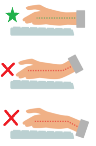 | Wrists bend backward when typing | Backward bending causes stress to the wrist, forearm and elbow. It compresses sensitive tissues over the carpal tunnel leading to pain and possibly numbness in the wrist, hands and fingers.